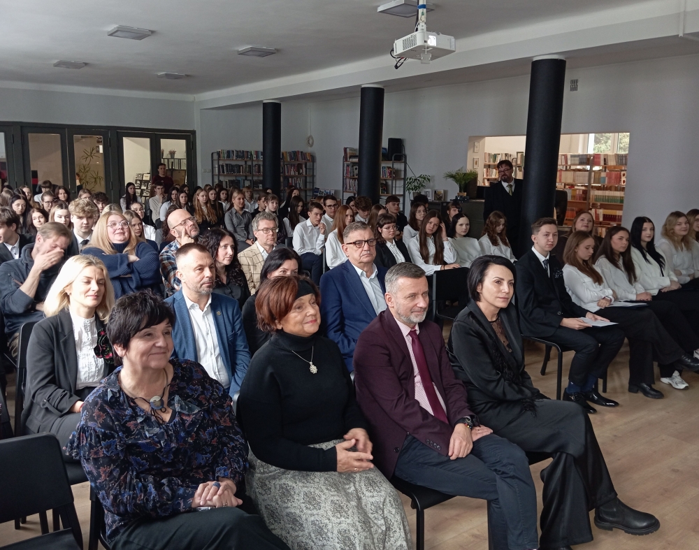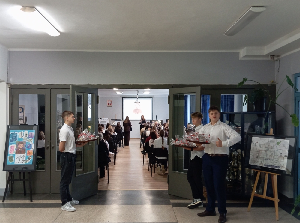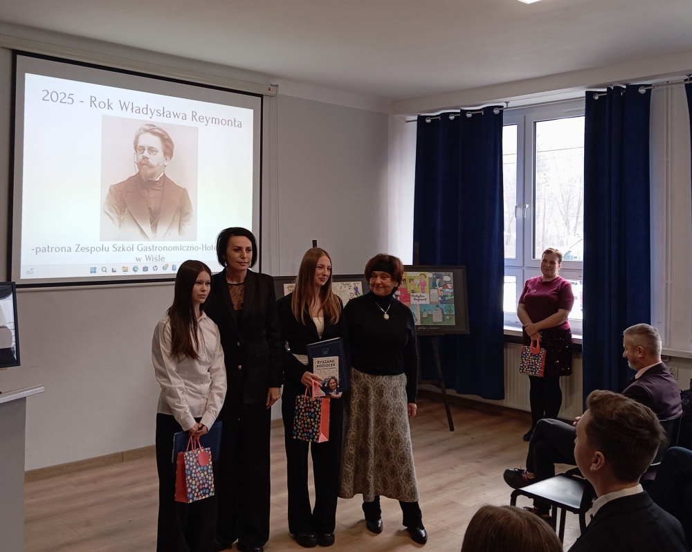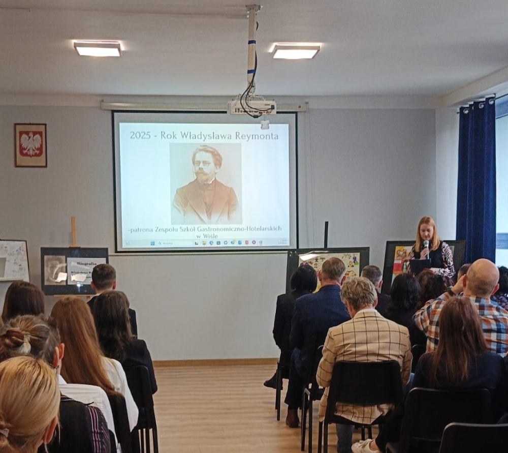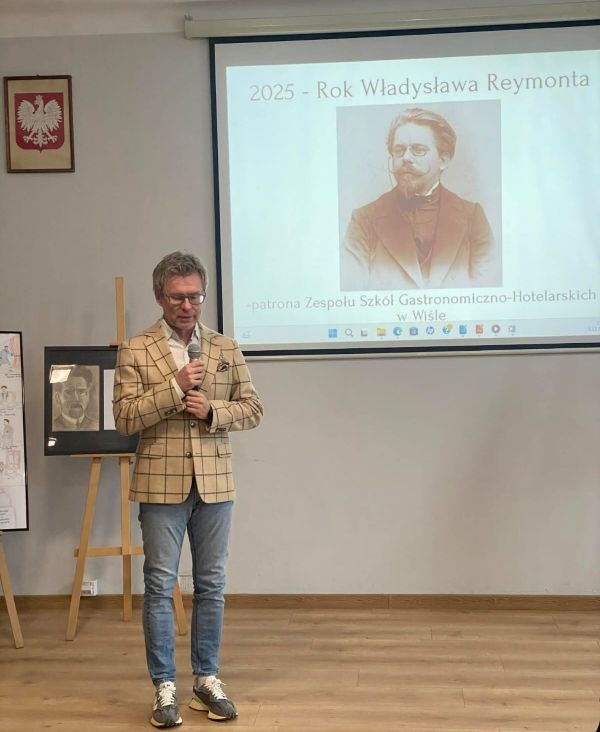 Tak znamienite rocznice związane z patronem naszej szkoły stały się zatem pretekstem do zainaugurowania Festiwalu Reymontowskiego, którym wchodzimy w jubileusz 90-lecia Zespołu Szkół Gastronomiczno-Hotelarskich im. Władysława Reymonta w Wiśle – o czym mówiła pani dyrektor Kornelii Zubek, witając szacownych gości: panią Janinę Żagan - Starostę Powiatu Cieszyńskiego, pana Michała Rajwę – Naczelnika Wydziału Edukacji, panią Danutę Łabaj – Przewodniczącą Komisji Edukacji, panią Anetę Legierską-Bujok – Przewodniczącą Komisji Kultury, Sportu i Promocji, panią Katarzynę Czyż-Kaźmierczak - Zastępczynię Burmistrza Miasta Wisła, pana Zdzisława Pilcha –Radnego Miasta Wisła, pana Zbigniewa Wuwera – Prezesa Wiślańskiego Stowarzyszenia Sportowego, pana dr. Sebastiana Chachołka – Dyrektora Muzeum Magicznego Realizmu w Wiśle, panią Annę Łupieżowiec – Dyrektor Wiślańskiego Centrum Kultury wraz z panią Kamillą Księżnik, panem Andrzejem Drobikiem oraz panem Szymonem Pilchem (zaangażowanymi w realizację podcastu „Zupełna cisza - Reymont w Wiśle".