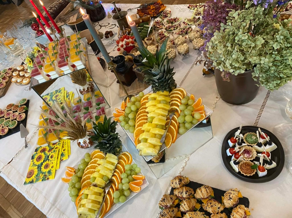 z pietyzmem czuwają nauczyciele gastronomii. Od sztuki słowazmierzamy w kierunku sztuki kulinarnej – a mianowicie bankietu zatytułowanego „Cztery pory roku” według pomysłu i aranżacji pana Dawida Kołaczyka.Wśród impresji kolorów, zapachów i smaków możemy z radością częstować się przygotowanymi specjałami. Festiwal Reymontowski miał też swój kulinarny akcent przygotowany dla całej społeczności szkolnej – w postaci piernika ozdobionego – opłatkiem, z którego dumnie spoglądał Władysław Reymont w roku mu poświęconym.