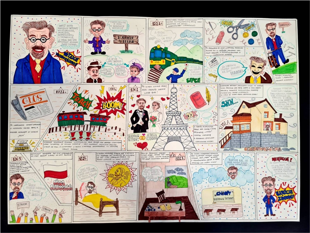 Od multimedialnych form wyrażenia biografii Reymonta przeszliśmy do formy komiksu. Komiks o Reymoncie przygotowały Klaudia Chraścina i Diana Samowędziuk z klasy 4T. Uczennice w pieczołowity sposób zilustrowały wszystkie najważniejsze momenty z życia pisarza. Wzbogaciły ów biograficzny „świat przerysowany” w bogatą warstwę informacyjną i anegdotyczną. Wszystkie fakty z życia Reymonta od narodzin do śmierci i pomnik pośmiertny autora wnikliwie opowiedziały.